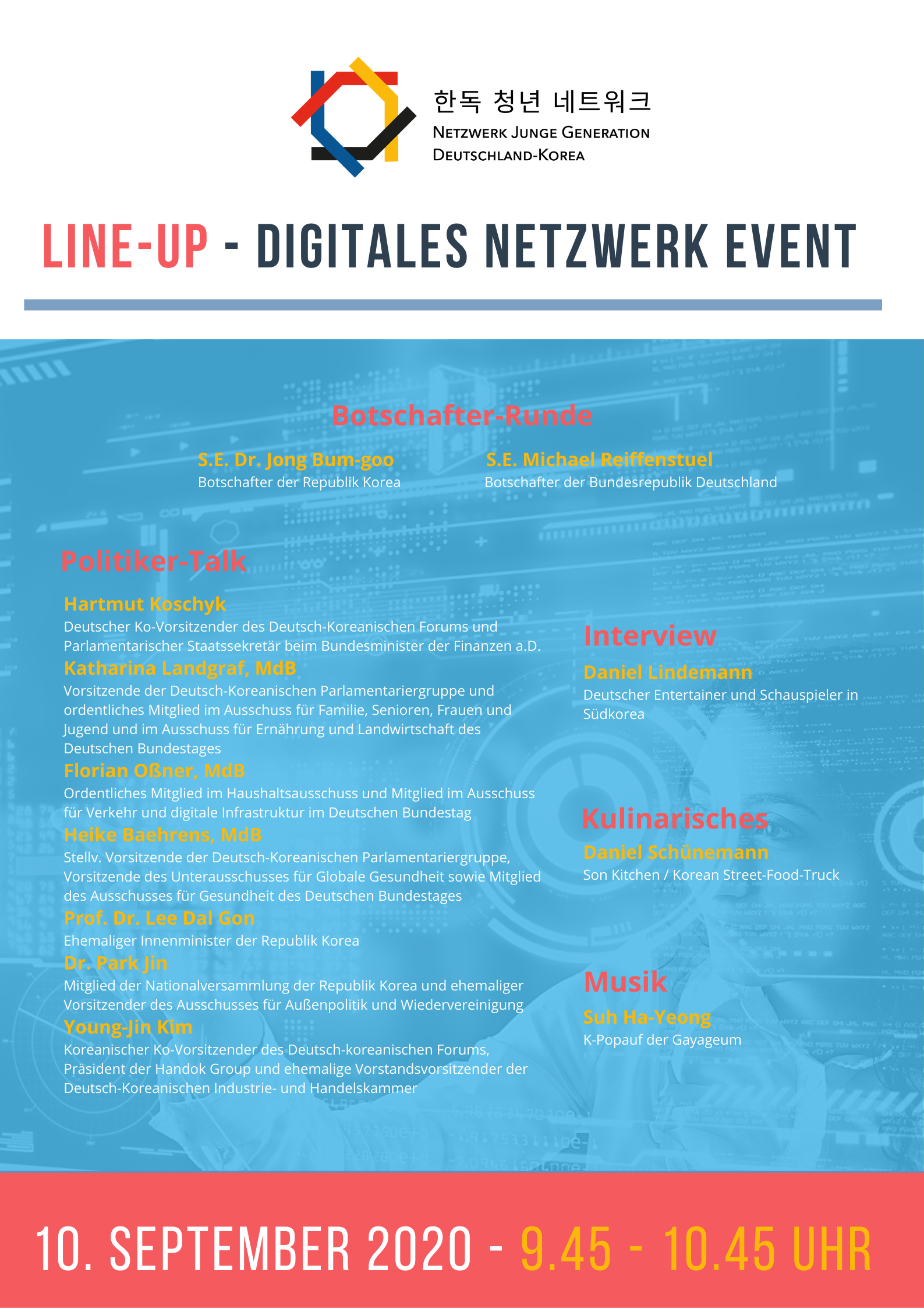 In einem etwa 60-minütigen Facebook-Live-Stream am Donnerstag, 10. September 2020 von 9.45 bis 10.45 Uhr mit Gästen aus der deutschen und koreanischen Politik, Gesellschaft und Unterhaltungsindustrie geht es um Themen, die die junge Generation beider Länder dieser Tage bewegen. Um Corona, Digitalisierung und darum, warum belastbare Netzwerke in diesen Zeiten so wichtig sind. Ebenfalls wird aufgezeigt, was das Netzwerk Junge Generation Deutschland Korea konkret macht. Präsentiert wird die Show von jungen Menschen aus dem Netzwerk, die sich in die deutsch-koreanischen Beziehungen einmischen und der Stimme der Jugend Gehör verschaffen wollen. Das Event wird inhaltlich anspruchsvoll, informativ aber gleichzeitig unterhaltsam, modern und jugendlich.
